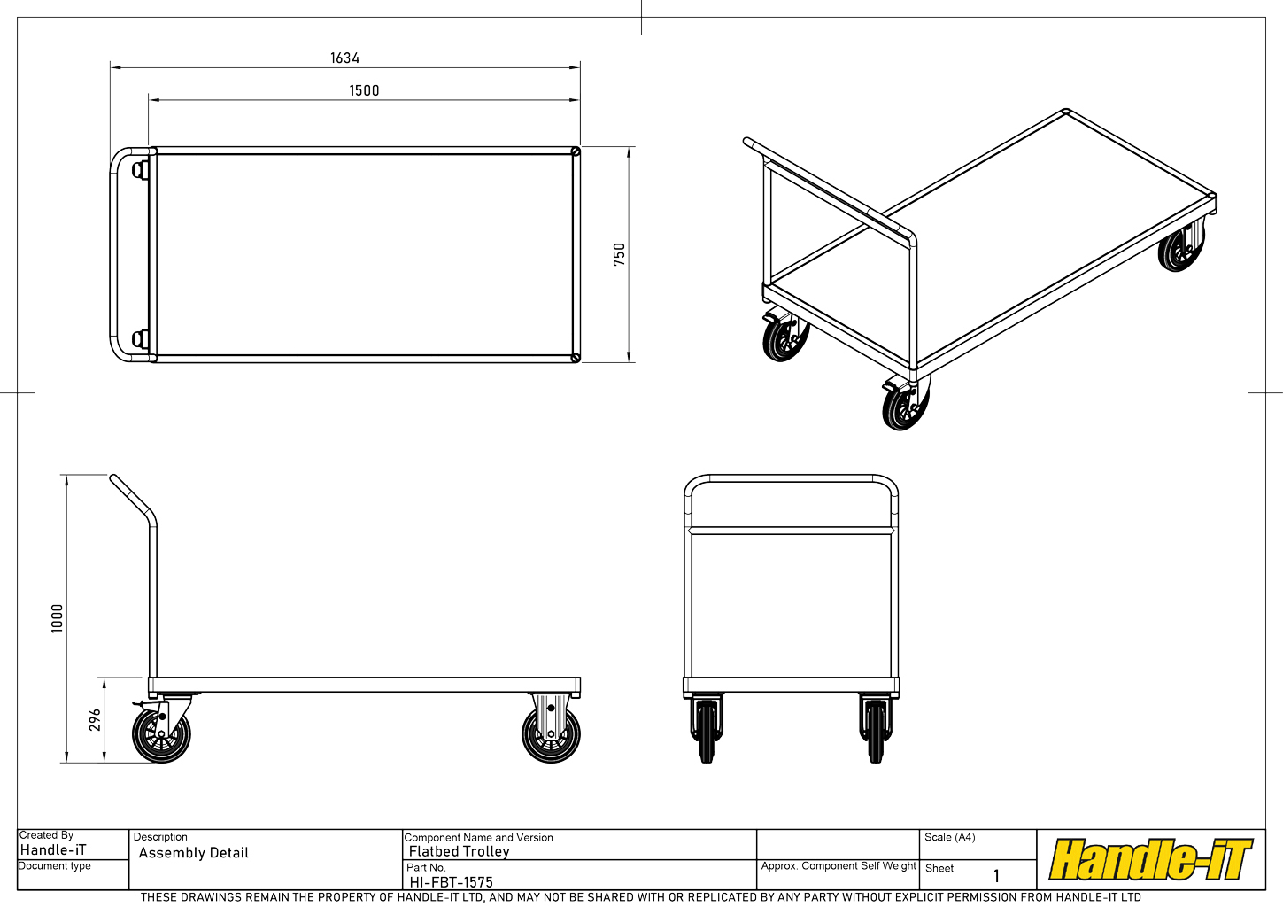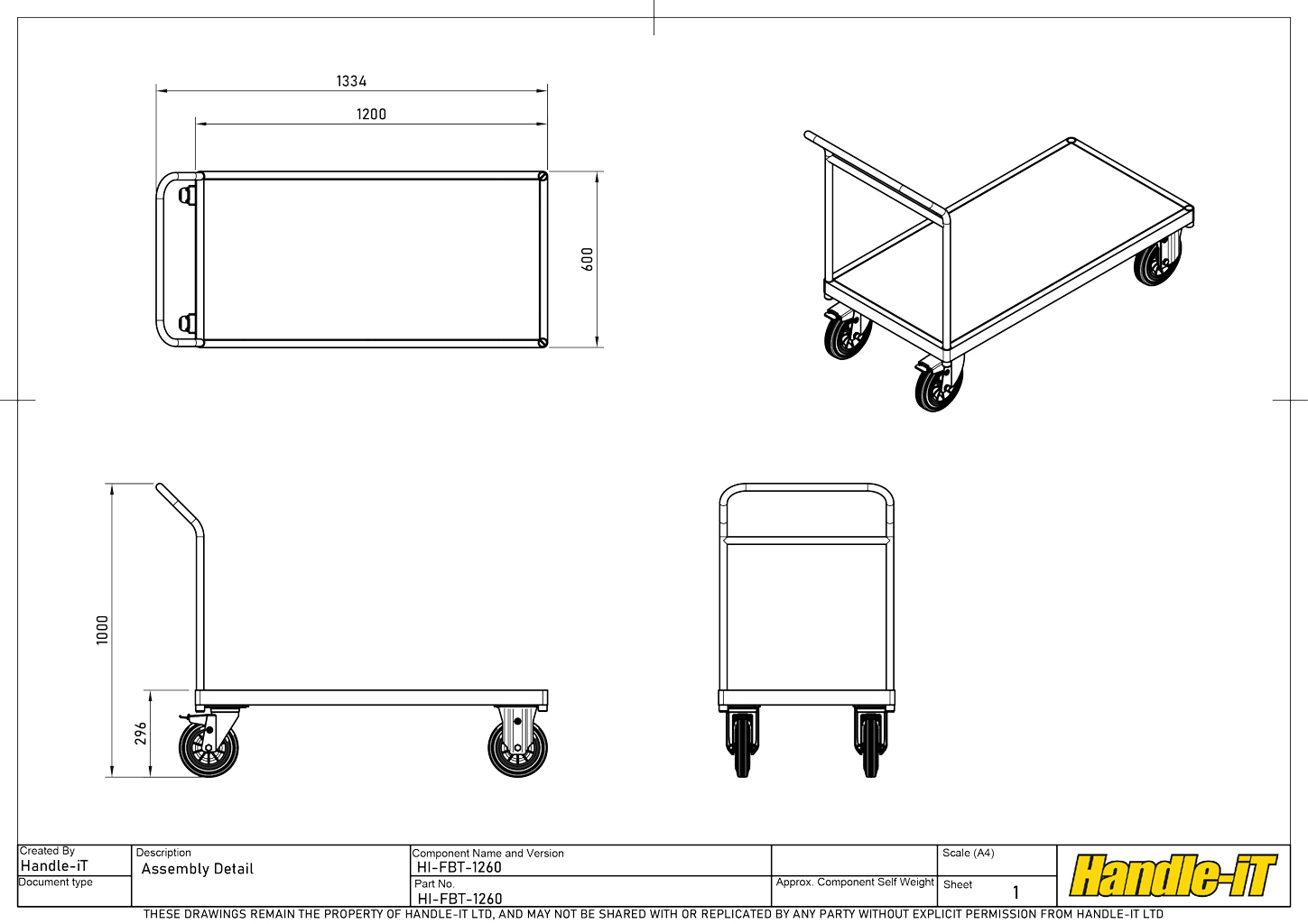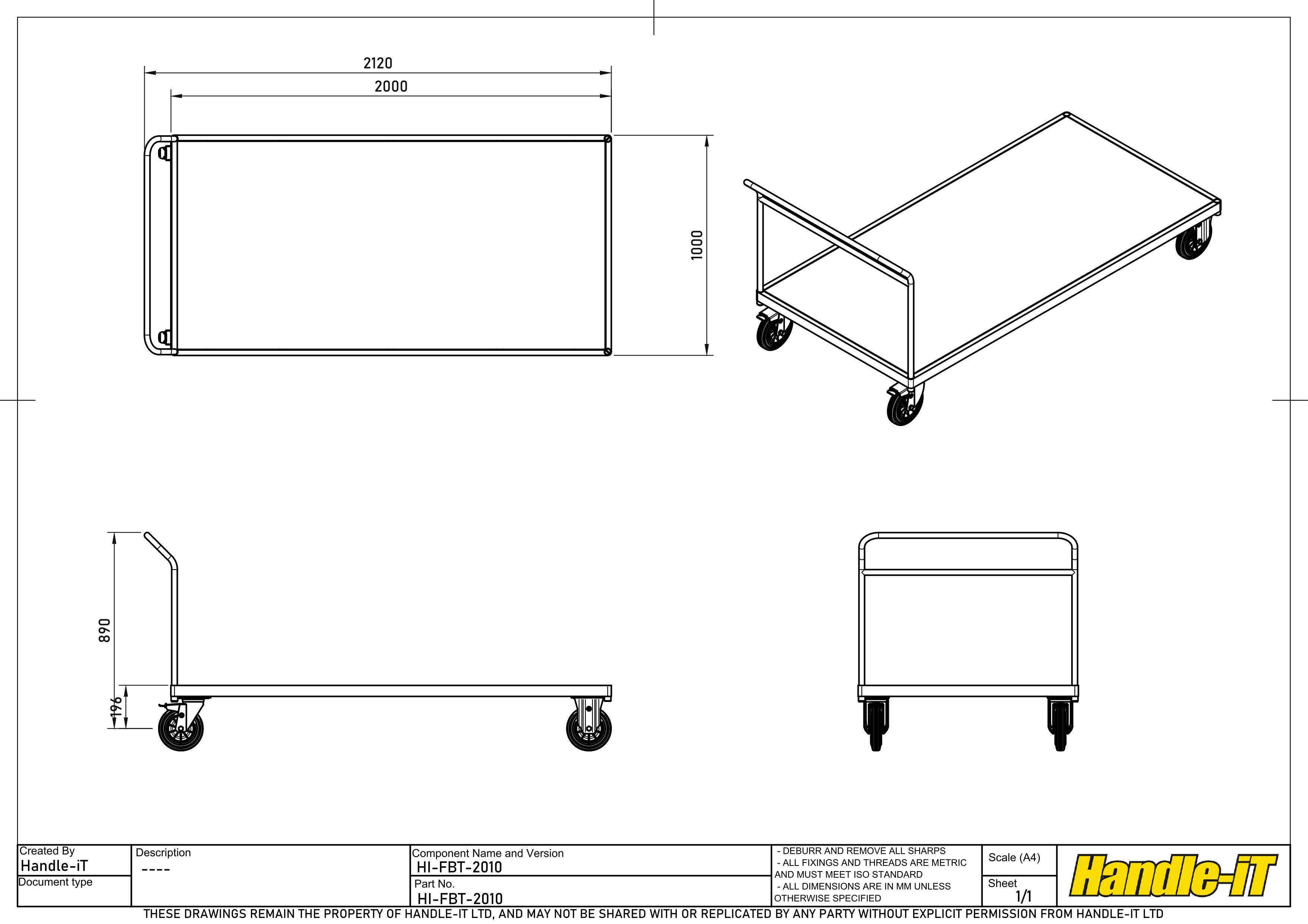 El carro de plataforma forma parte de la gama Premium de carros de plataforma y carros. Con asas ubicadas a la altura de trabajo ideal y en ángulo con respecto a la base para eliminar el riesgo de tropiezos, gracias a la distancia legal de 120 mm. La base, cortada a láser y fabricada a partir de una sola pieza de secciones cuadradas de 50 mm x 25 mm, formada alrededor de los spigots, crea una esquina redondeada en lugar de una esquina ingleteada y pronunciada que perforaría las paredes y los tobillos en caso de colisión. Montada sobre ruedas de alta calidad de 200 mm de diámetro, con dos ruedas fijas para la dirección y dos giratorias con freno para mayor maniobrabilidad y seguridad, que se adapta a cualquier terreno firme. Acabada con un recubrimiento industrial de poliéster en polvo, resistente a los arañazos. Nuestras gamas Premium y Premium Plus de carros de plataforma cumplen con la norma BS-EN1757-1, lo que le da la confianza de que Handle-iT es su opción más segura.